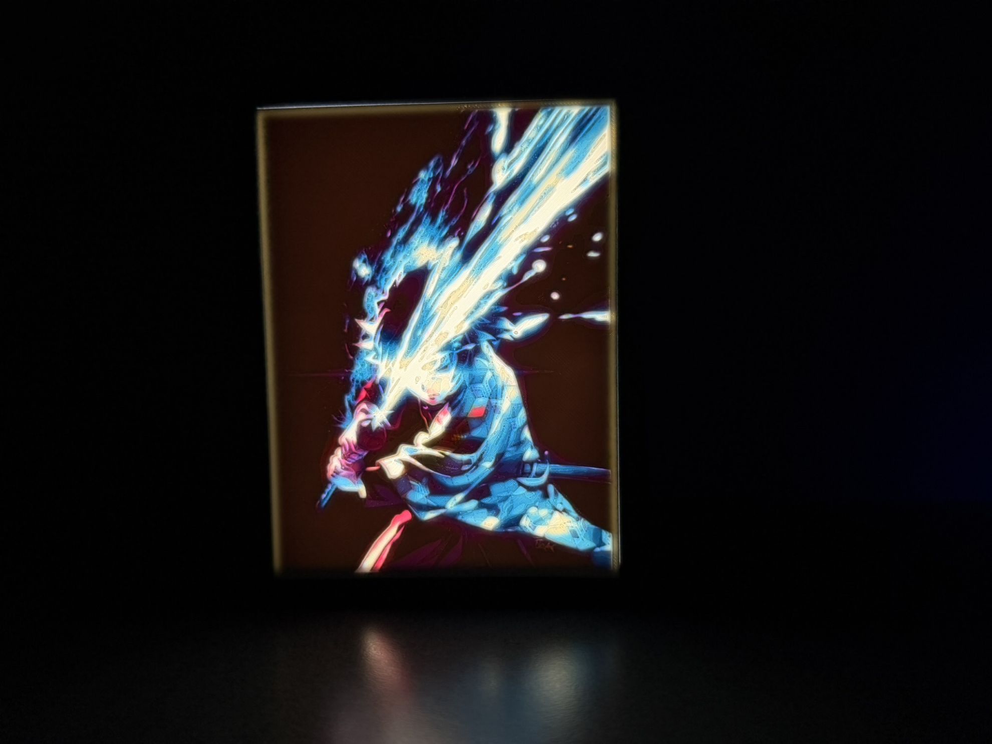 Der stabile Rahmen verleiht dem Lichtbild eine hochwertige Optik und schützt das Motiv. Dank des mitgelieferten Standfußes kann es direkt auf Schreibtisch, Sideboard, Regal oder im Gaming-Bereich platziert werden – ohne zusätzliche Montage.