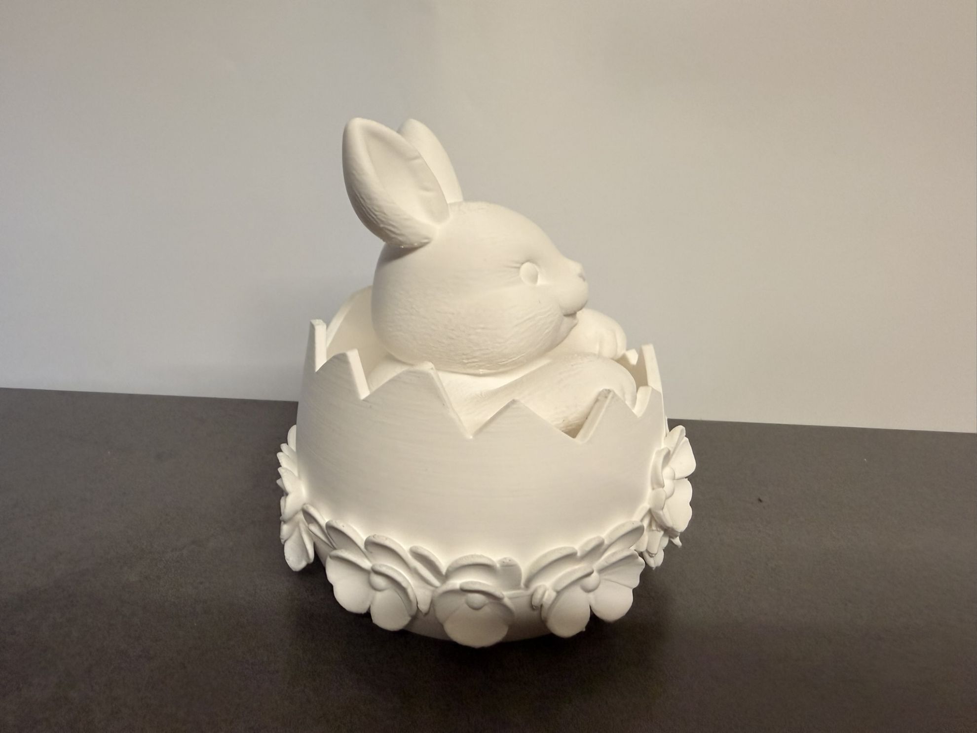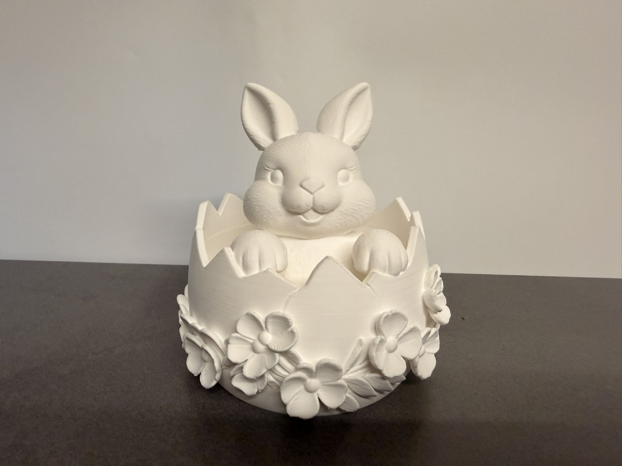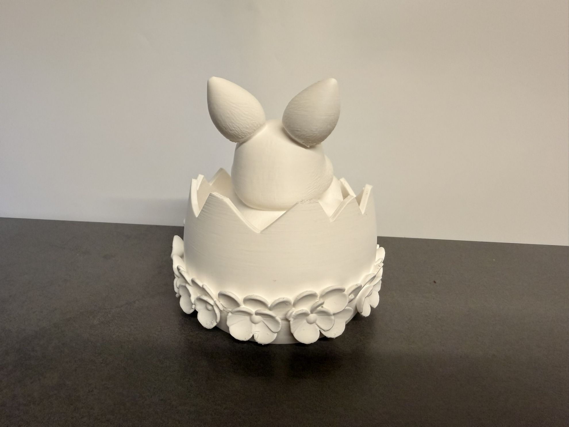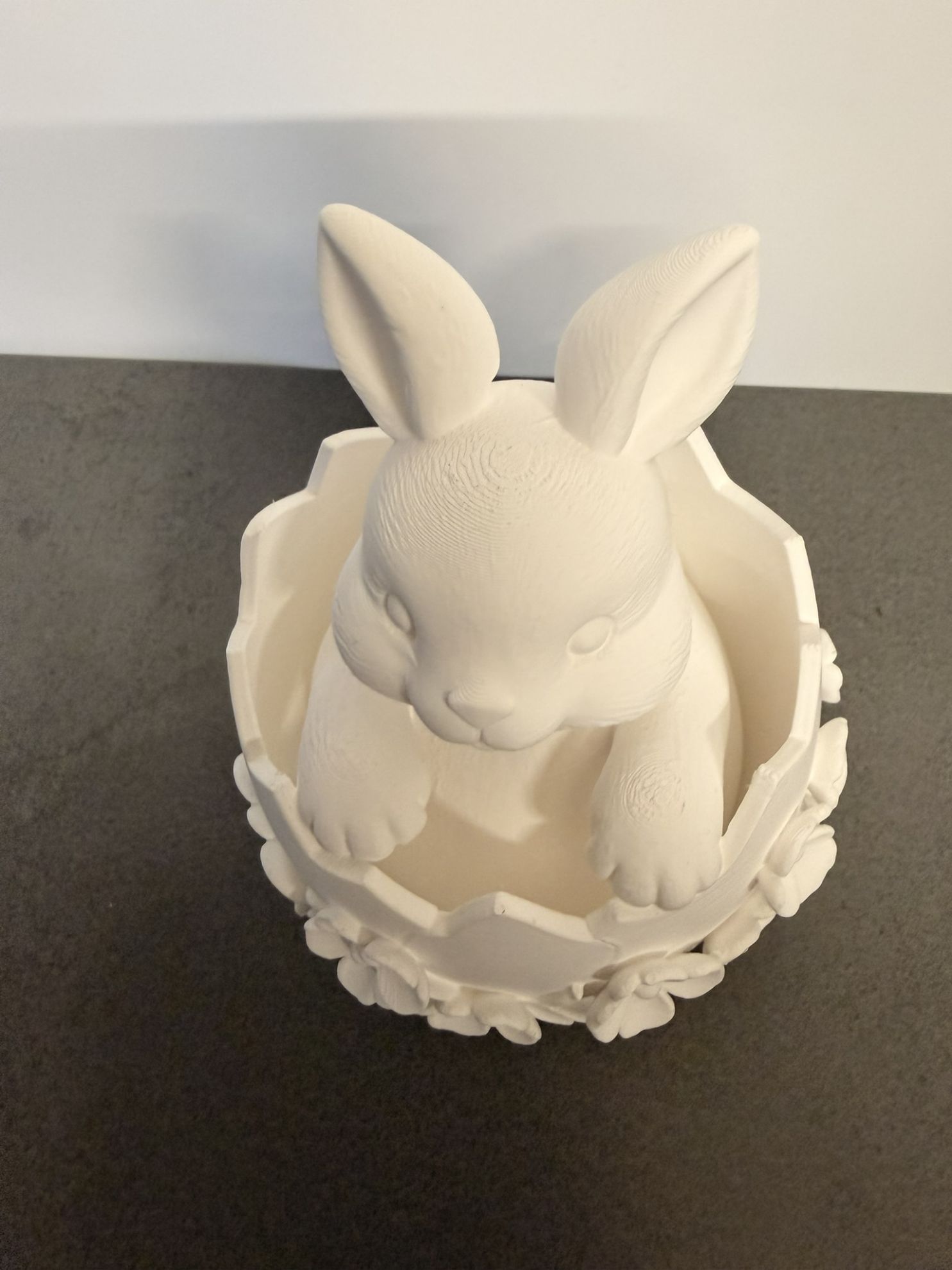 Die Kombination aus verspieltem Motiv und moderner 3D-Druckstruktur macht diese Figur zu einem besonderen Blickfang. Die matte Oberfläche und die feinen Details – von den Hasenpfoten bis zu den Blumen am Sockel – sorgen für eine hochwertige, stilvolle Optik.