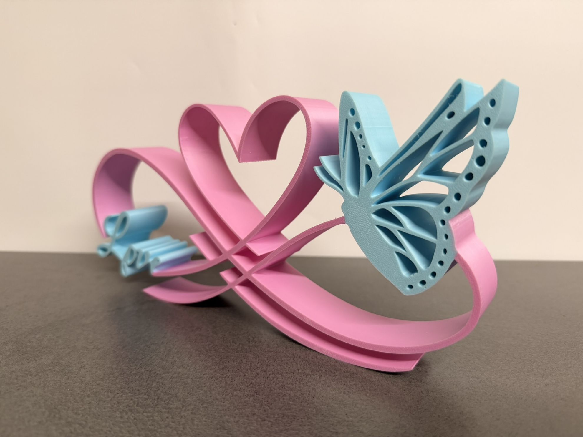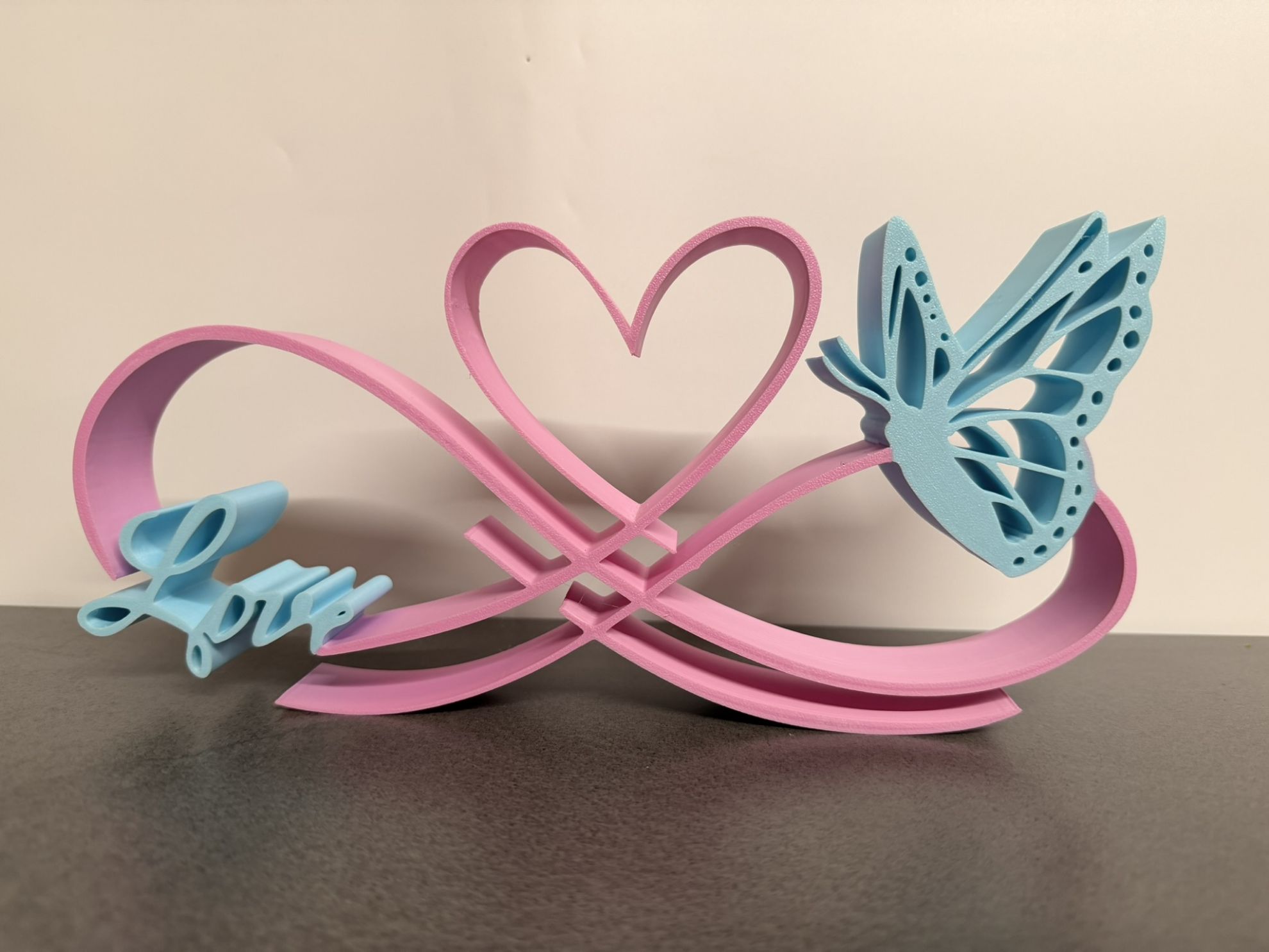 Dieses faszinierende Infinity-3D-Schild steht für ewige Liebe: Links das geschwungene "LOVE"-Design, rechts ein detaillierter Schmetterling mit Herz-Elementen – als mehrfarbiger 3D-Druck mit bis zu 2 individuell wählbaren Farben (z. B. Pink für das Band/Herz und Babyblau für "LOVE"/Schmetterling). Hergestellt in unserer Eigenproduktion für perfekten Farbkontrast, Tiefe und Qualität.