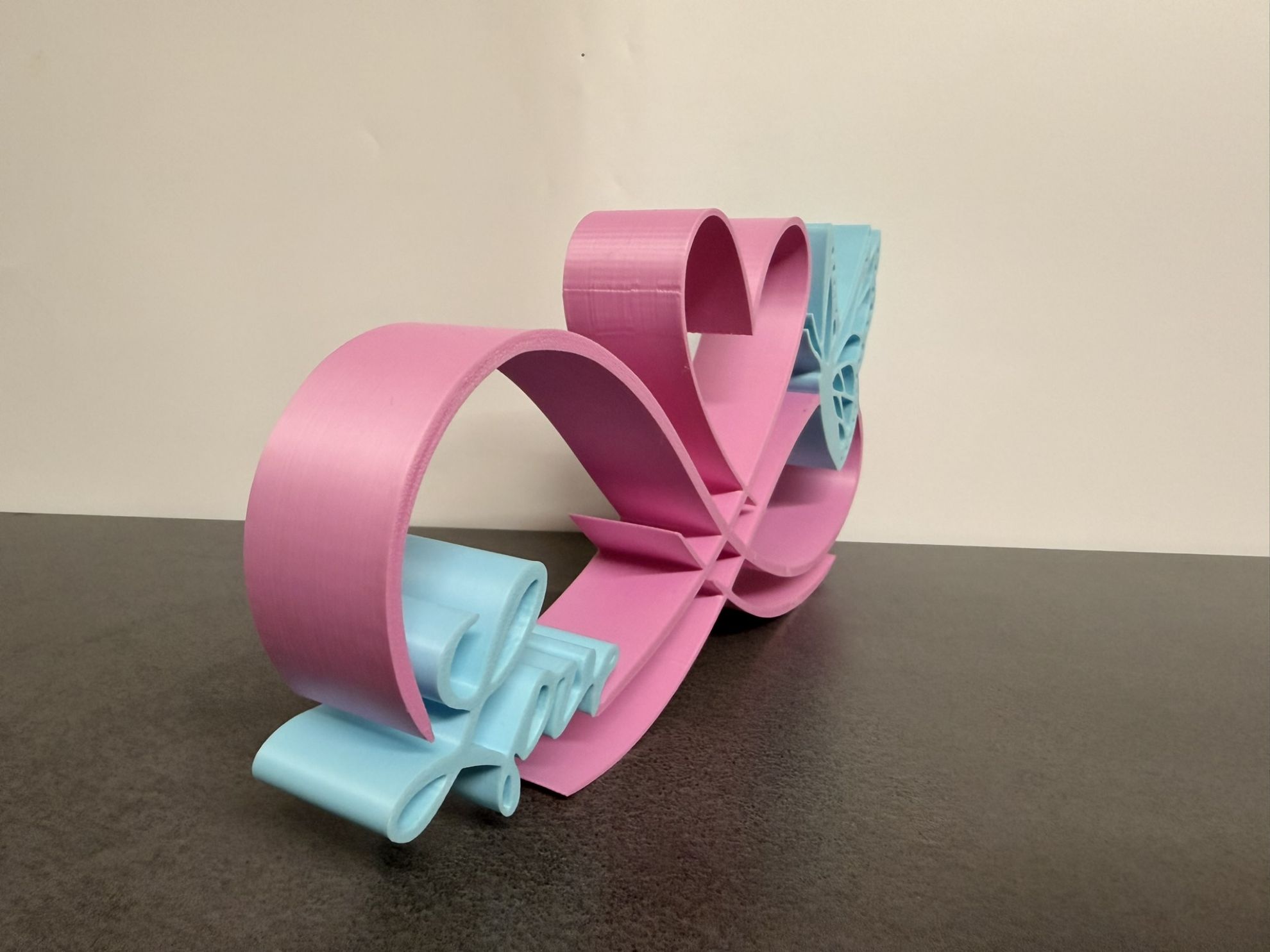 Material & Fertigung: Mehrfarbiger 3D-Druck (bis 2 Farben, z. B. Pink & Blau PLA), stufig gebändert