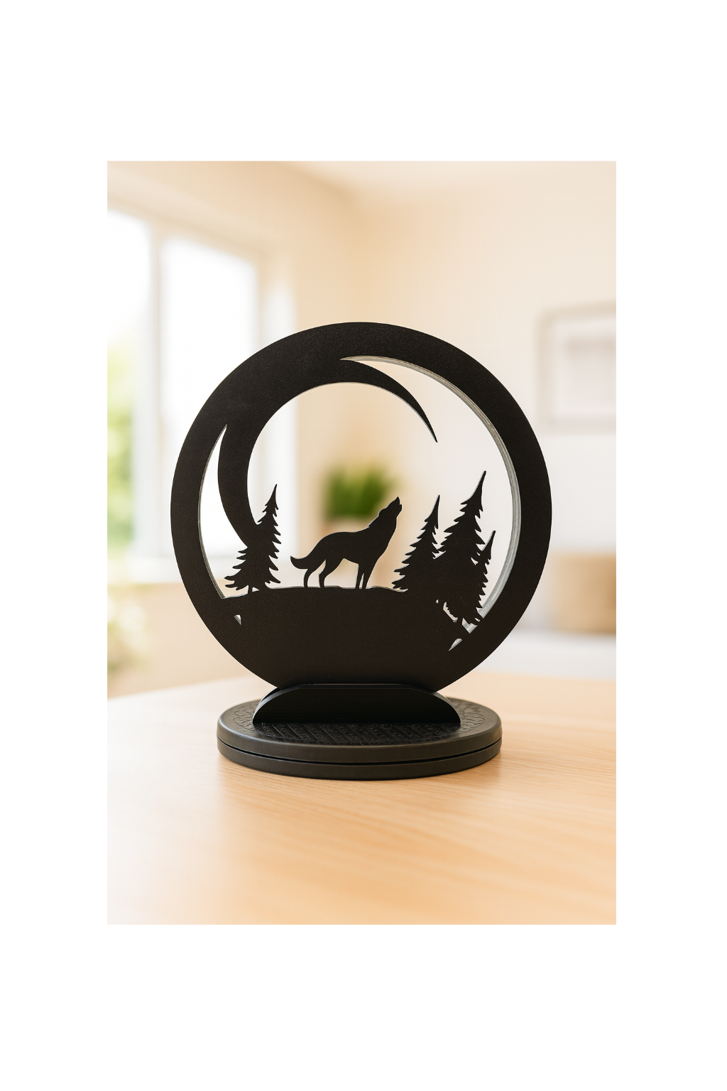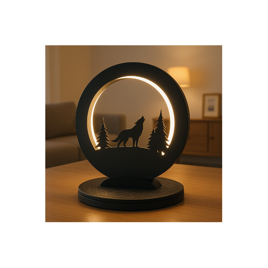 Die LED-Ringlampe mit Wolfsgesang-Motiv vereint moderne Beleuchtung mit kraftvoller Symbolik. Ein eindrucksvoller Wolf, der den Mond anheult, wird durch das klare, kaltweiße Licht stimmungsvoll hervorgehoben und schafft eine besondere Atmosphäre.